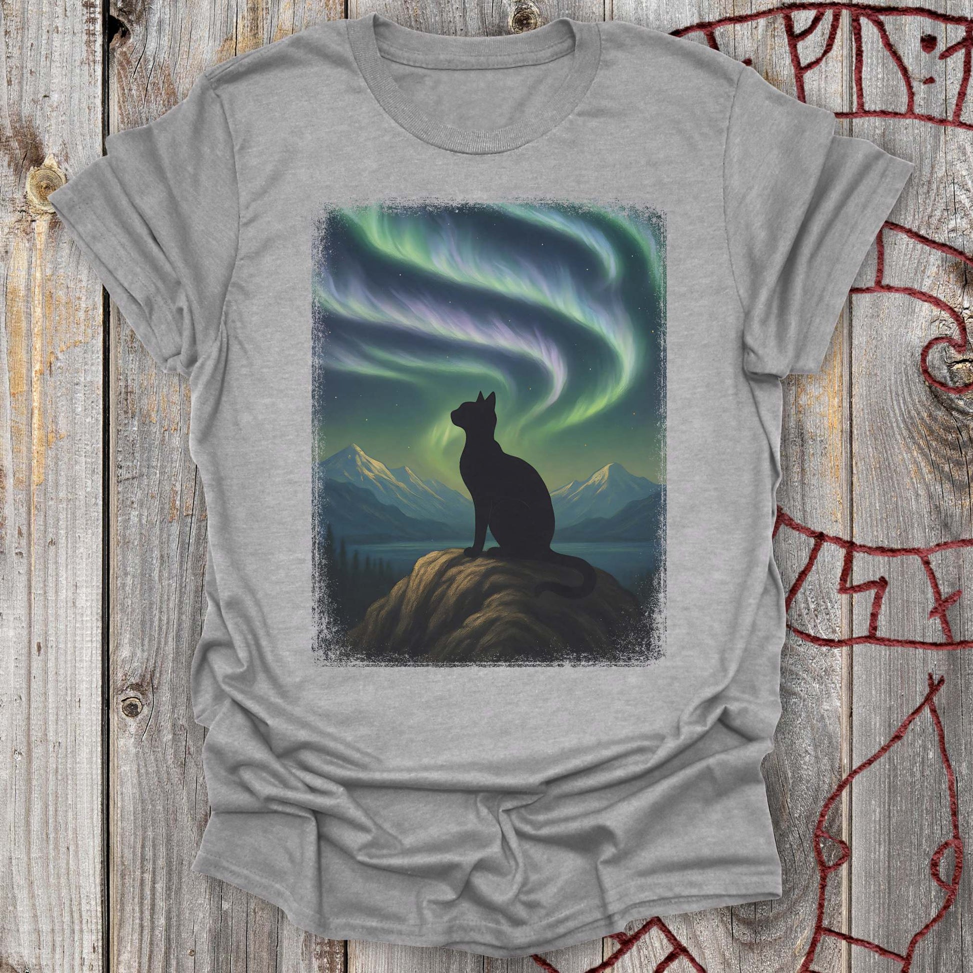 Black Cat & Northern Lights T-Shirt features a silhouette of a black cat, gazing at the northern Lights, aurora, in a dreamy night scene. This tee is the perfect gift for cat lovers drawn to magic, art, and arctic skies.
