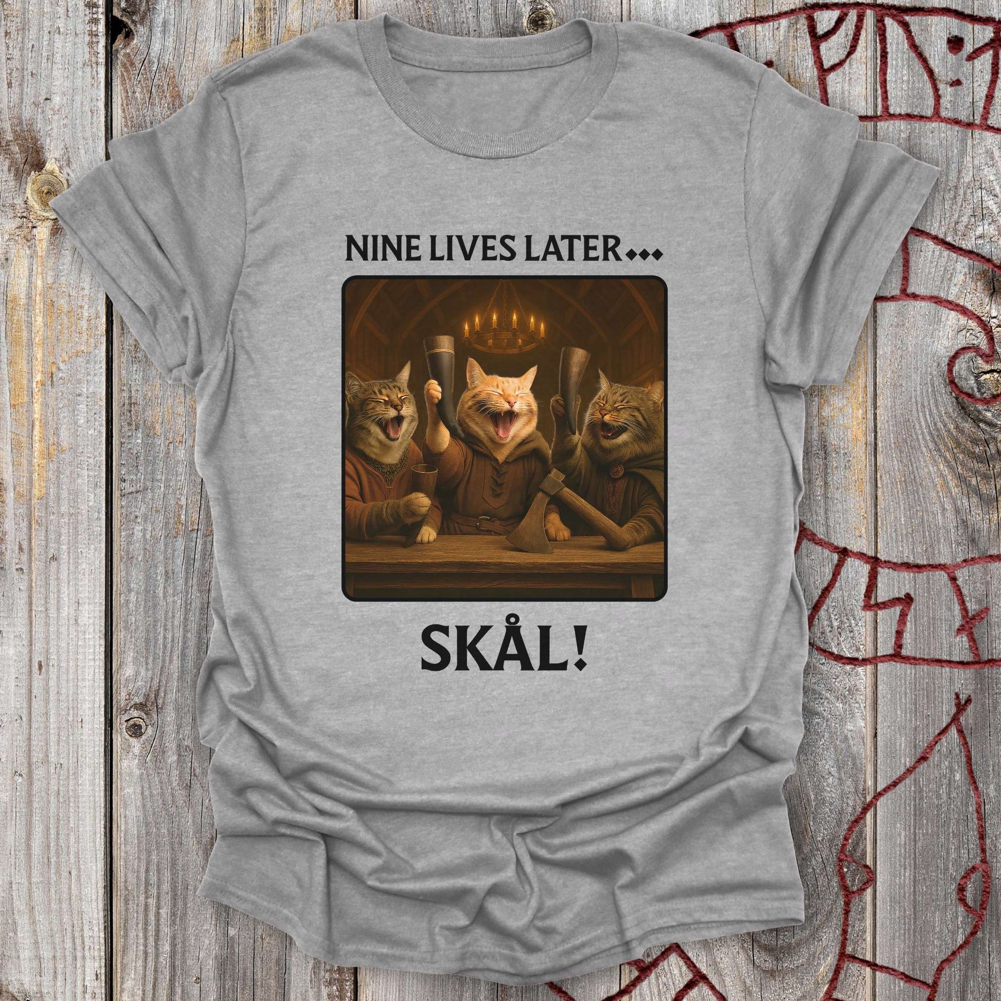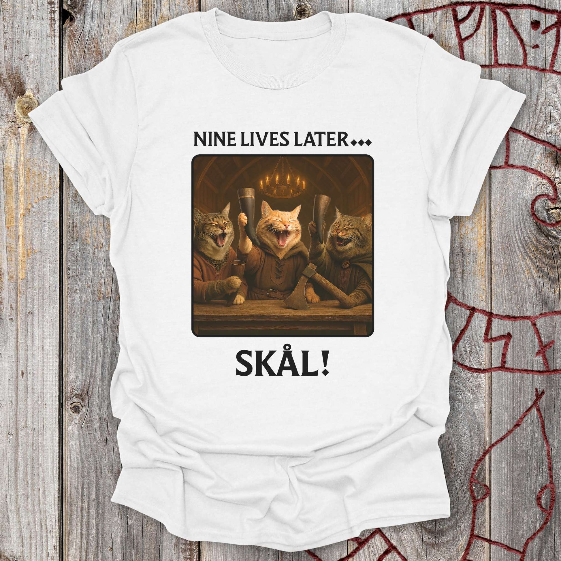 Nine Lives Later - Valhalla Feast T-Shirt captures the spirit of Viking camaraderie with a hilarious cat twist. Raise your horn and join the feast! Three mighty cats sit in Valhalla, laughing and toasting after nine lives of adventure, with the norse word, still used to this day, "Skål". It’s a blend of Norse heritage, humor, and charm. Let's celebrate cat's nine lives in style – Skål!
